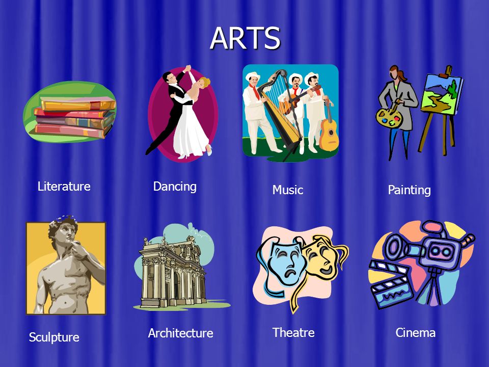 Painting, sculpture, architecture, literature, music, performing arts, and cinema.